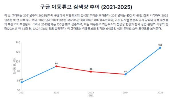 그래프는 2021년부터 2025년까지 구글에서 야동튜브의 검색량 추이를 보여준다. 2021년에는 월간 약 65만 회로 시작하여 2022년에는 95만 회로 증가했다. 2023년과 2024년에는 각각 85만 회와 80만 회로 감소했으며, 이는 디지털 콘텐츠 규제 강화와 경쟁 플랫폼의 부상으로 추정된다. 그러나 2025년에는 130만 회로 급증하며, 이는 야동튜브 최신주소의 접근성 향상과 한국 성인 콘텐츠 시장의 성장(2024년 약 1.2조 원, CAGR 7.8%)으로 설명된다. 이 그래프는 야동튜브의 인기와 남성들의 성인 콘텐츠 소비 트렌드를 보여준다.