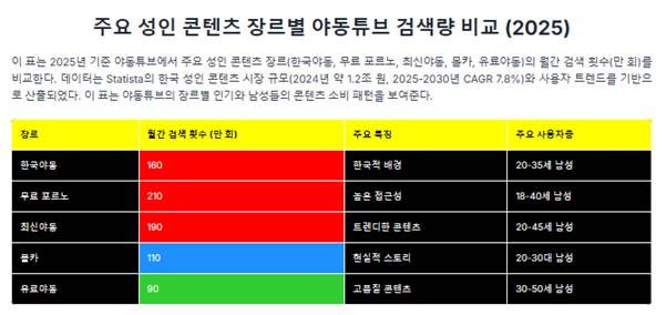 이 표는 2025년 기준 야동튜브에서 주요 성인 콘텐츠 장르(한국야동, 무료 포르노, 최신야동, 몰카, 유료야동)의 월간 검색 횟수(만회)를 비교한다. 데이터는 Statista의 한국 성인 콘텐츠 시장 규모(2024년 약 1.2조원, 2025-2030년 CAGR 7.8%)와 사용자 트렌드를 기반으로 산출되었다.