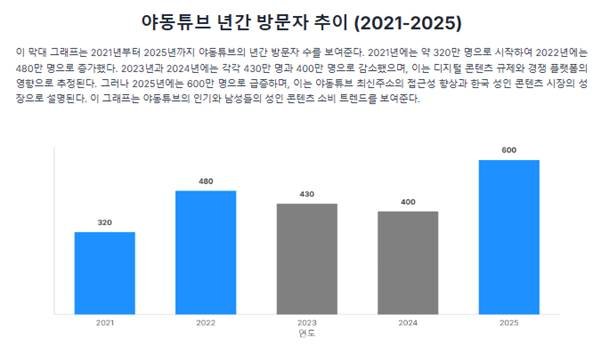 그래프는 2021년부터 2025년까지 야동튜브의 년간 방문자 수(만명)를 보여준다. 2021년에는 약 320만 명으로 시작하여 2022년에는 480만 명으로 증가했다. 2023년과 2024년에는 각각 430만 명과 400만 명으로 감소했으며, 이는 디지털 콘텐츠 규제와 경쟁 플랫폼의 영향으로 추정된다. 그러나 2025년에는 600만 명으로 급증하며, 이는 야동튜브 최신주소의 접근성 향상과 한국 성인 콘텐츠 시장의 성장으로 설명된다. 이 그래프는 야동튜브의 인기와 남성들의 성인 콘텐츠 소비 트렌드를 보여준다.