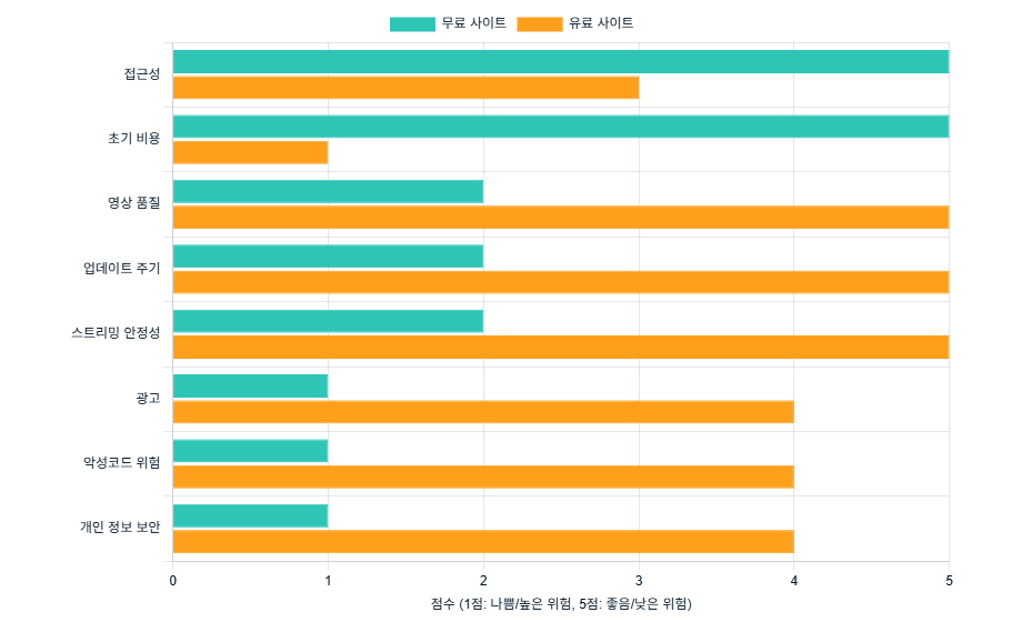 무료 사이트는 접근성과 초기 비용에서 높은 점수를 보이지만, 영상 품질, 안정성, 특히 보안 측면에서는 유료 사이트가 월등히 우수함을 알 수 있습니다.