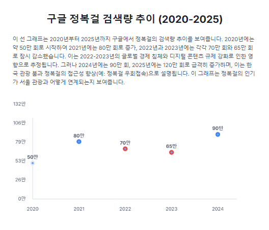 그래프는 2020년부터 2025년까지 구글에서 정복걸의 검색량 추이를 보여줍니다. 2020년에는 약 50만 회로 시작하여 2021년에는 80만 회로 증가, 2022년과 2023년에는 각각 70만 회와 65만 회로 잠시 감소했습니다. 이는 2022-2023년의 글로벌 경제 침체와 디지털 콘텐츠 규제 강화로 인한 영향으로 추정됩니다. 그러나 2024년에는 90만 회, 2025년에는 120만 회로 급격히 증가하며, 이는 한국 관광 붐과 정복걸의 접근성 향상(예: 정복걸 우회접속)으로 설명됩니다.