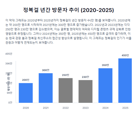 그래프는 2020년부터 2025년까지 정복걸의 년간 방문자 수(만 명)를 보여줍니다. 2020년에는 약 200만 명으로 시작하여 2021년에는 300만 명으로 증가했습니다. 2022년과 2023년에는 각각 250만 명과 230만 명으로 감소했으며, 이는 글로벌 팬데믹의 여파와 디지털 콘텐츠 규제 강화로 인한 영향으로 추정됩니다. 그러나 2024년에는 350만 명, 2025년에는 450만 명으로 급격히 증가하며, 이는 한국 관광 붐과 정복걸 최신주소의 접근성 향상으로 설명됩니다.