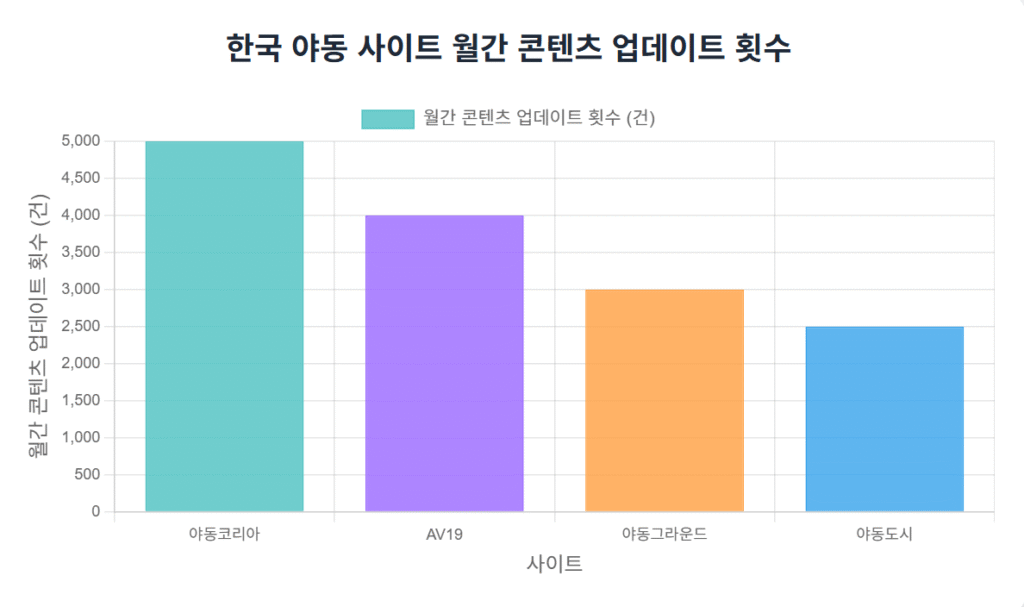 위 그래프는 한국 야동 사이트들의 월간 콘텐츠 업데이트 횟수를 비교 분석한 자료입니다. 야동코리아가 월 5,000건으로 가장 활발한 업데이트를 보여 콘텐츠 양에서 우위를 차지하고 있습니다. AV19, 야동그라운드, 야동도시 역시 꾸준한 업데이트로 사용자들에게 다양한 콘텐츠를 제공하고 있음을 알 수 있습니다