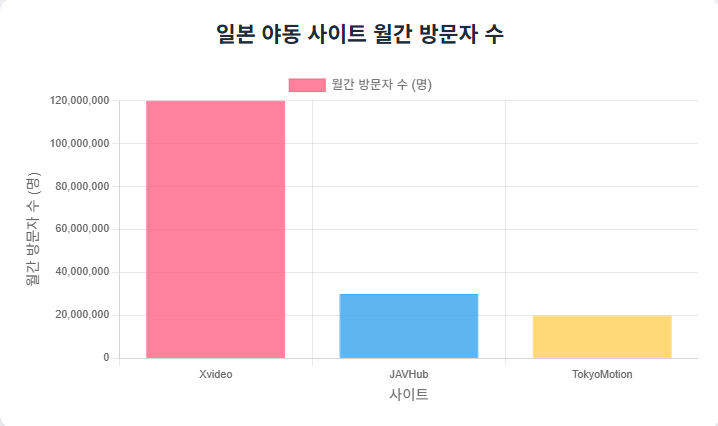 위 그래프는 주요 일본 야동 사이트들의 2025년 6월 기준 월간 방문자 수를 시각화한 자료입니다. Xvideo가 1.2억 명으로 압도적인 방문자 수를 기록하며 시장을 선도하고 있으며, JAVHub와 TokyoMotion이 그 뒤를 잇고 있습니다. 이는 각 사이트의 시장 점유율과 영향력을 명확하게 보여줍니다.