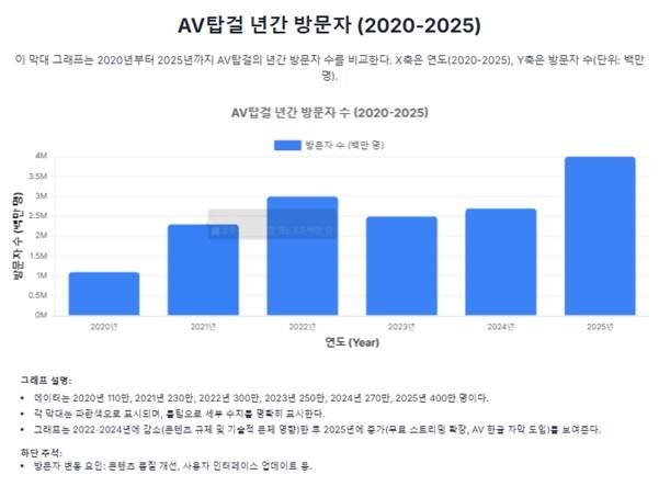 그래프는 2020년부터 2025년까지 AV탑걸의 년간 방문자 수를 비교한다. X축은 연도(2020-2025), Y축은 방문자 수(단위: 백만 명). 2020년 110만, 2021년 230만, 2022년 300만, 2023년 250만 (감소), 2024년 270만 (감소), 2025년 400만 (증가). 각 막대는 파란색으로 표시되며, 툴팁으로 세부 수치를 명확히 표시한다. 그래프는 2022-2024년에 감소(콘텐츠 규제 및 기술적 문제 영향)한 후 2025년에 증가(무료스트리밍 확장, AV한글자막 도입)를 보여준다. 하단 주석에는 방문자 변동 요인(콘텐츠 품질 개선, 사용자 인터페이스 업데이트)이 설명된다. 막대 그래프 형식은 연도별 수치 비교를 직관적으로 제시하며, 연간 트렌드를 명확히 시각화한다.