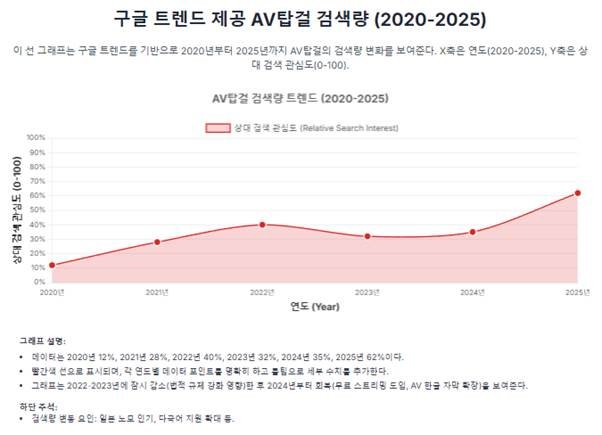 그래프는 구글 트렌드를 기반으로 2020년부터 2025년까지 AV탑걸의 검색량 변화를 보여준다. X축은 연도(2020-2025), Y축은 상대 검색 관심도(0-100). 2020년 12%, 2021년 28%, 2022년 40%, 2023년 32% (감소), 2024년 35%, 2025년 62%. 빨간색 선으로 표시되며, 각 연도별 데이터 포인트를 명확히 하고 툴팁으로 세부 수치를 추가한다. 그래프는 2022-2023년에 잠시 감소(법적 규제 강화 영향)한 후 2024년부터 회복(무료스트리밍 도입, AV한글자막 확장)을 보여준다. 하단 주석에는 검색량 변동 요인(일본노모 인기, 다국어 지원 확대)이 설명된다. 선 그래프 형식은 연간 트렌드 변화를 직관적으로 시각화한다.